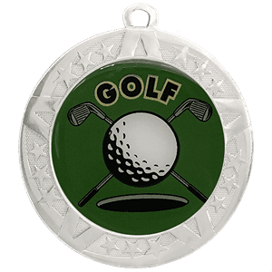 These Golf insert medals feature a 2 3/4 inch silver frame with a colorful 2 inch Epoxy dome subject decal. Each medal also includes a red, white and blue neck ribbon. Optional personalization on back. Great for golf season events and tournament recognition. Ships from: Marquette, Michigan. SKU: golf-jisf-tc.