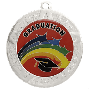 These Graduation insert medals feature a 2 3/4 inch silver frame with a colorful 2 inch Epoxy dome subject decal. Each medal also includes a red, white and blue neck ribbon. Optional personalization on back. Wonderful for celebrating accomplishments and milestones. Outstanding for graduation ceremony celebrations and academic milestones. Ships from: Marquette, Michigan. SKU: graduation-jisf-tc.