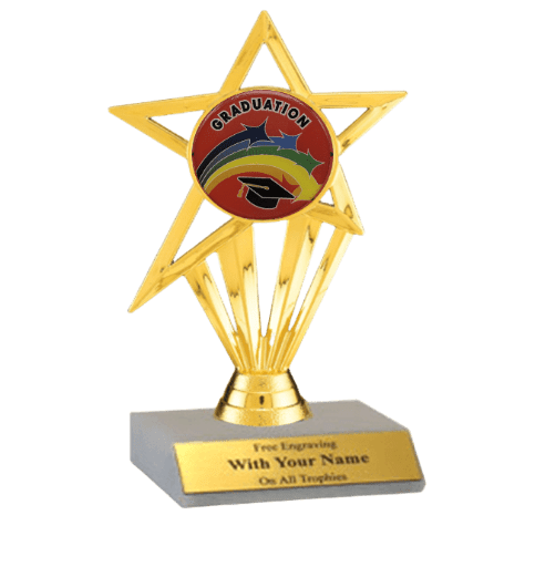 This insert participation trophy features a slant-front white marble base with a gold insert holder and 2" Graduation design insert. Measures approximately 7" tall. Outstanding for celebrating art skills and dedication. Ships from: Marquette, Michigan. SKU: insert-participation-graduation-tc.
