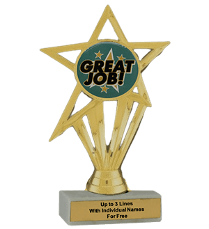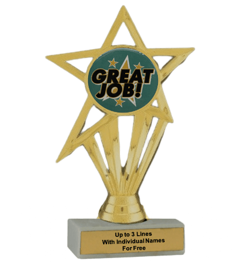 Our economy insert trophy features a real white marble base with a gold insert holder and 2" Great Job insert. Measures approximately 6 7/8" - 7 1/8" tall. Add up to three lines of text personalized engraving for free, including individual names! Ships from: Marquette, Michigan. SKU: great-job-e-part-i-tc.