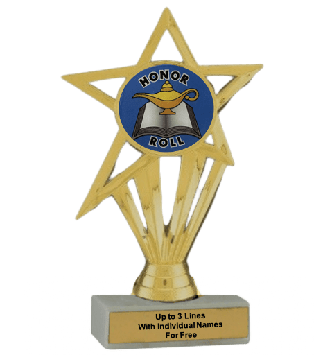 Our economy insert trophy features a real white marble base with a gold insert holder and 2" Honor Roll insert. Measures approximately 6 7/8" - 7 1/8" tall. Add up to three lines of text personalized engraving for free, including individual names! Ships from: Marquette, Michigan. SKU: honor-roll-e-part-i-tc.