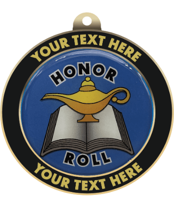 These colorful Honor Roll insert medals feature a unique customizable front rim. Each medal also features an antique gold frame with a star design and 2" Epoxy dome decal insert for a spectacular look. Price includes a red, white and blue neck ribbon. Medal frame measures 2 3/4". Optional personalization on back. roll-mc-pr-tc. Wonderful for honoring accomplishments and milestones. Ships from: Marquette, Michigan. SKU: honor.