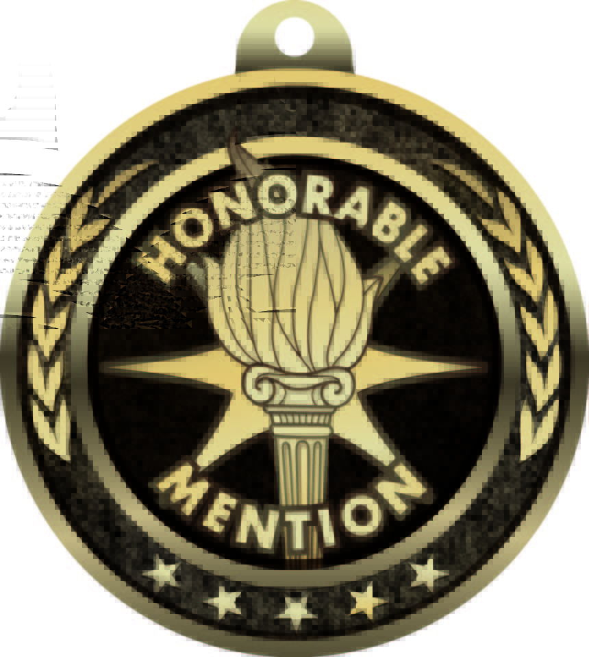 Our antique gold honorable mention medal was designed exclusively for Trophy Central! Each medal features a black color-fill for a unique look and includes a red, white and blue neck ribbon. Medal measures 2 1/4". Optional personalization on back. SKU: honorable-mg-tc.