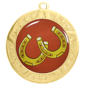 These Horseshoes insert medals feature a 2 3/4 inch gold frame with a colorful 2 inch Epoxy dome subject decal. Each medal also includes a red, white and blue neck ribbon. Optional personalization on back. Wonderful for recognizing accomplishments and milestones. Ships from: Marquette, Michigan. SKU: horseshoes-jigf-tc.