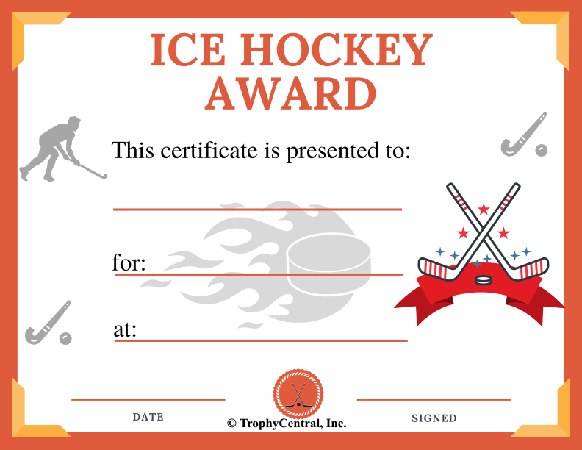 This is a free Ice Hockey certificate template! Our free certificates were designed to be printable and use less ink to save you money. Simply press the View Now Button and then right click on the image and select Save File to download it. Award certificates measure 8 1/2" x 11". Outstanding for acknowledging achievement and success. SKU: ice-hockey-free-tc.