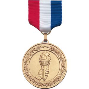 These well-priced 2" Olympic-Style Torch Medals are offered in gold, silver and bronze. They include a free neck or military ribbon. Choose our most popular red, white and blue ribbon or select your school colors. Ships in 1-2 days blank or 3-5 days with personalized engraving. Wonderful for celebrating accomplishments and milestones. Ships from: Mount Vernon, New York. SKU: j9665-cm.