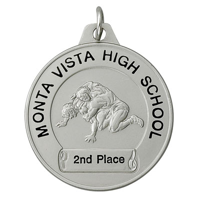 Our 1 1/2" TCM Series Silver Wrestling Front Imprint Medals include your school or organization around the outer perimeter, the year and place printed on the front, and a neck or drape ribbon! Optional medal personalized engraving on medal back. Outstanding for honoring wrestling excellence and achievement. Ships from: Mount Vernon, New York. SKU: m162s-cm.