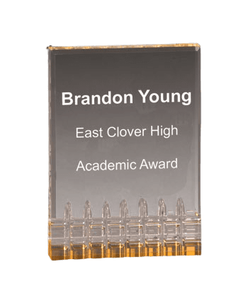 This 3" x 5" Mirage Award features a reflective gold base and is 1" thick so it sits sturdily on a desk or bookshelf. Price includes 8 free lines of text personalized engraving; logo optional. Magnificent for honoring excellence and victory. Ships from: Marquette, Michigan. SKU: MR31g-tc.