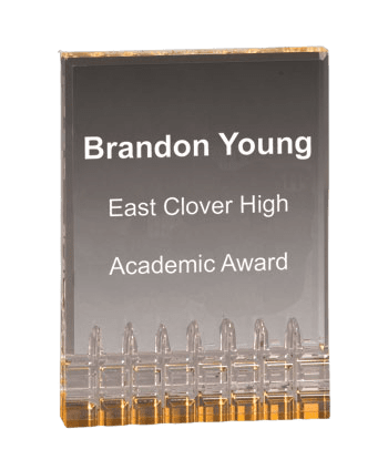 The 4" x 6" Mirage Award is 1" thick with reflective gold base. Price includes personalized engraving. Magnificent for honoring excellence and victory. Ships from: Marquette, Michigan. SKU: MR32g-tc.