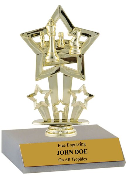 This slim line chess trophy features excellent quality at a low price. Features a slant-front white marble base with a gold plastic figure. Approximately 5 1/2" - 6" tall. mqt-chess-p-nc. Outstanding for recognizing chess excellence and achievement. Ships from: Marquette, Michigan. SKU: mqt-chess-p-nc.