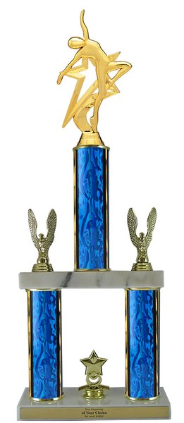 Our Winners Line boasts two tiers, two gold eagles, a star trim, choice of column color & size, marble bases and free personalization! Perfect for special events and tournaments. Subject / Figure: Gold Dancer with Star design. Ships from: Marquette, Michigan. SKU: mqt-dancer-tt.