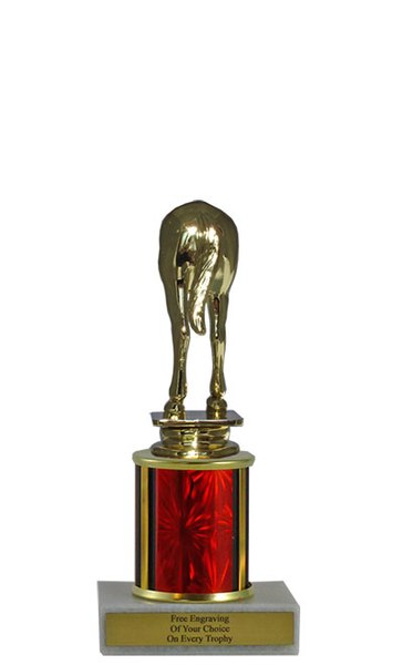 This classic column trophy is designed to save you money without sacrificing quality. It features a simple marble base, choice of column size and plastic gag / horses-rear figure. Includes up to 3 lines of free personalized engraving. A bold and humorous trophy for competitions with a sense of humor. Ships from: Marquette, Michigan. SKU: mqthorsescb.