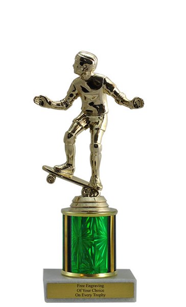 This classic column trophy is designed to save you money without sacrificing quality. It features a simple marble base, choice of column size and plastic skateboarding figure. Includes up to 3 lines of free personalized engraving. Magnificent for honoring excellence and victory. Ships from: Marquette, Michigan. SKU: qsskateboardscb-qtt.