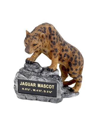 This realistic looking Jaguar trophy measures 5 7/8"h x 4 1/2"w x 3 1/8"d and is sculptured in resin and Includes up to 3 lines of free personalization. Ships in 4-5 days from New York. Be sure to also see our school and sports spirit Jaguar mascot medals and pins. SKU: MT2006-CM.