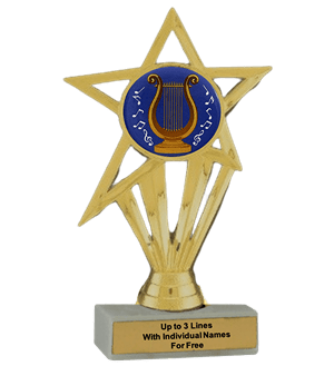 Our economy insert trophy features a real white marble base with a gold insert holder and 2" Music Lyre insert. Measures approximately 6 7/8" - 7 1/8" tall. Up to three text personalized engraving free, including individual names! Outstanding for celebrating music skills and dedication. Ships from: Marquette, Michigan. SKU: music-lyre-e-part-i-tc.