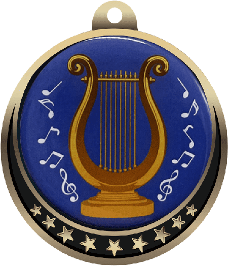 These colorful music lyre insert medals were designed exclusively for Trophy Central! Each medal features an antique gold frame with a star design and 2" subject insert for a spectacular look. Medals also include a red, white and blue neck ribbon. Medal frame measures 2 3/8". Optional personalization on back. Outstanding for celebrating music skills and dedication. Ships from: Marquette, Michigan. SKU: music-lyre-mc-tc.