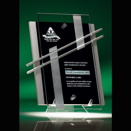 This design is living proof that plaques need not be boring. Made of lacquered wood and suspended glass, this cutting edge award is set off by two aluminum rods that command attention with style. The Nova Plaque is easily hung, or will stand alone with its acrylic stand. Measures: 11.5"H x 10"W. The Nova Plaque price includes personalized engraving. Magnificent for recognizing excellence and victory. SKU: 485-jc.