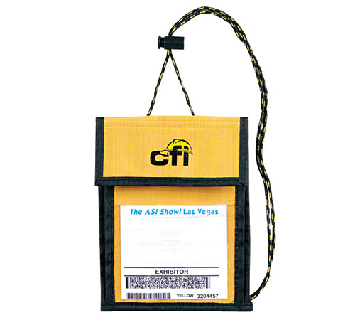 These yellow convention badge holders feature one main compartment with Velcro closure. One opened pocket on the flap. One front clear PVC window for Name Card / Badge. One rear open pocket with one pen loop. Adjustable nylon cord & lock. Measures 5.5w x 7h. 300 D rip stop polyester with PVC backing. Price includes one-color and one location screen print. Screen: Centered on front clear PVC open pocket (3"W x 3"H) or Centered on rear open pocket (3"W x 3"H) Please upload the vector-based logo after checkout. Ships from: Hacienda Heights, California. SKU: nw-3633yel-bn.