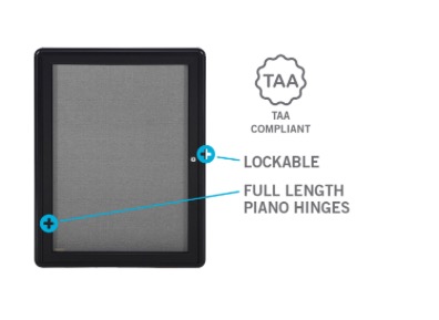 Ghent's Ovation Enclosed Bulletin Board is a sleek, modern take on the traditional message center. The fabric bulletin surface is paired with a powder-coat black matte frame that suits any environment. The radius frame and soft edges act as a mid-century modern accent, moving away from the more common industrial frame. Ghent's fabric bulletin board hides pin holes while holding announcements and papers tight against the board. The fabric surface is colorfast, so you won't have to worry about the surface fading or wearing down over time. Shatter-resistant acrylic panels make the enclosed board safe, never having to worry about shattered glass or cracking. Full-length piano hinges give the doors additional strength so you can change information on the bulletin surface as often as you need without worrying the hinge will weaken. Each locking board comes with two keys and includes built-in hanging hardware, meaning you can keep your announcements and bulletins secure in public areas. Each board ships to you in Ghent's worry-free packaging, designed specifically for shipping enclosed boards. Ghent's Ovation Enclosed Fabric Bulletin Board carries a 10-year warranty and is made in the USA. Recommended for indoor use only. SKU: ovk1-f90-GT.