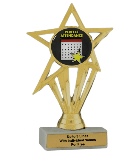 Our economy insert trophy features a real white marble base with a gold insert holder and 2" Perfect Attendance insert. Measures approximately 6 7/8" - 7 1/8" tall. Add up to three lines of text personalized engraving for free, including individual names! A great choice for acknowledging excellence and victory. Ships from: Marquette, Michigan. SKU: perfect-attendance-e-part-i-tc.