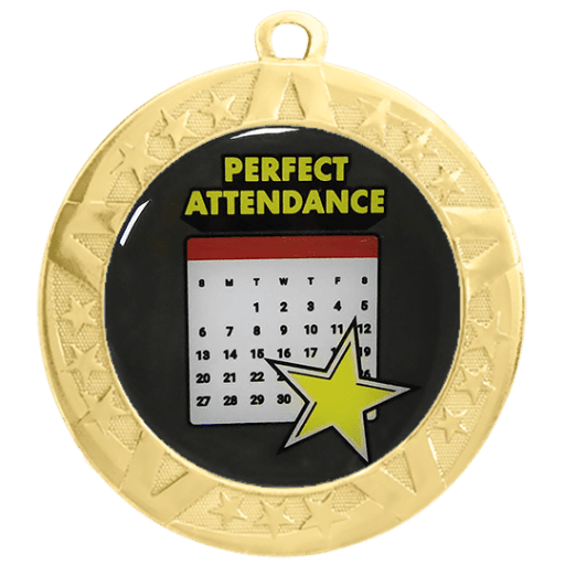 These Perfect Attendance insert medals feature a 2 3/4 inch gold frame with a colorful 2 inch Epoxy dome subject decal. Each medal also includes a red, white and blue neck ribbon. Optional personalization on back. Wonderful for honoring accomplishments and milestones. Ships from: Marquette, Michigan. SKU: perfect-attendance-jigf-tc.