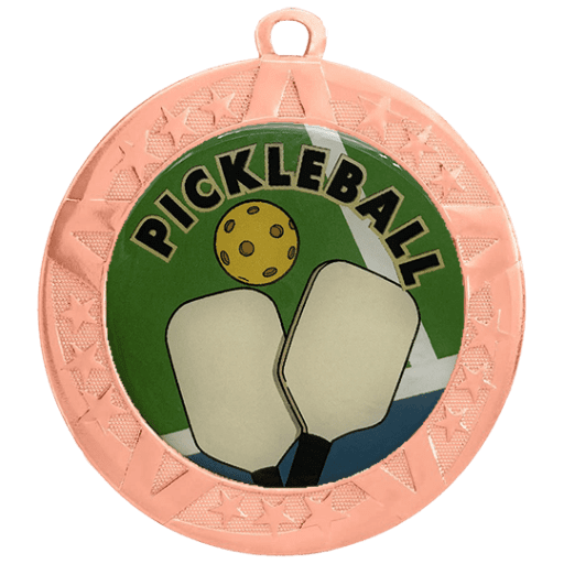 These Pickleball insert medals feature a 2 3/4 inch bronze frame with a colorful 2 inch Epoxy dome subject decal. Each medal also includes a red, white and blue neck ribbon. Optional personalization on back. Wonderful for rewarding accomplishments and milestones. Ships from: Marquette, Michigan. SKU: pickleball-jibf-tc.