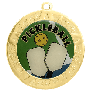 These Pickleball insert medals feature a 2 3/4 inch gold frame with a colorful 2 inch Epoxy dome subject decal. Each medal also includes a red, white and blue neck ribbon. Optional personalization on back. Wonderful for honoring accomplishments and milestones. Ships from: Marquette, Michigan. SKU: pickleball-jigf-tc.