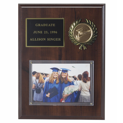 9 x 12 inch walnut finish photo plaque comes with black screened plate, plastic wreath, plexi-glass faceplate (holds a 4 x 6 inch photo), and takes 2 inch medallion insert. personalized engraving Plate is 3x4. Wonderful for recognizing accomplishments and milestones. Ships from: Mount Vernon, New York. SKU: ps5841.