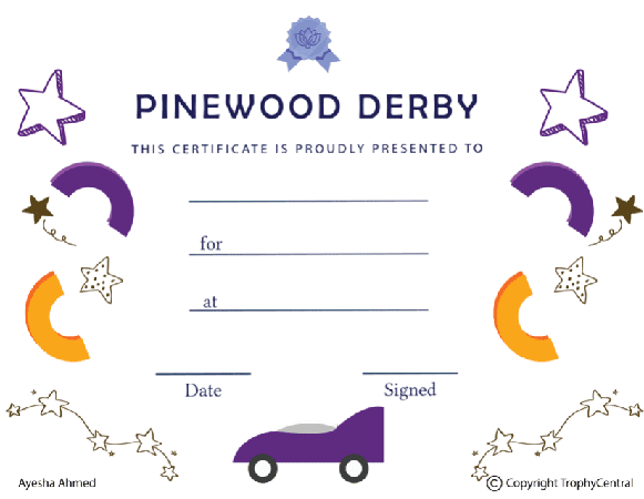 This is a free Pinewood Derby certificate template! Whether this is for your own child or the winner at this year's scouting event, it is sure to bring a smile to any recipient! Our free certificates were designed to be printable and use less ink to save you money. Simply press the View Now Button and then right click on the image and select Save File to download it. Award certificates measure 8 1/2" x 11". Be sure to see all of our Free Certificates and our great selection of Pinewood Derby Trophies and Awards. Outstanding for recognizing achievement and success. SKU: pinewood-derby-tc.