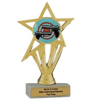 Our economy insert trophy features a real white marble base with a gold insert holder and 2" Pistol insert. Measures approximately 6 7/8" - 7 1/8" tall. Add up to three lines of text personalized engraving for free, including individual names! A wonderful choice for rewarding excellence and victory. Ships from: Marquette, Michigan. SKU: pistol-e-part-i-tc.