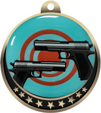 These colorful pistol insert medals were designed exclusively for Trophy Central! Each medal features an antique gold frame with a star design and 2" Epoxy dome decal insert for a spectacular look. Medals also include a red, white and blue neck ribbon. Medal frame measures 2 3/8". Optional personalization on back. A wonderful choice for rewarding excellence and victory. Ships from: Marquette, Michigan. SKU: pistols-mc-tc.
