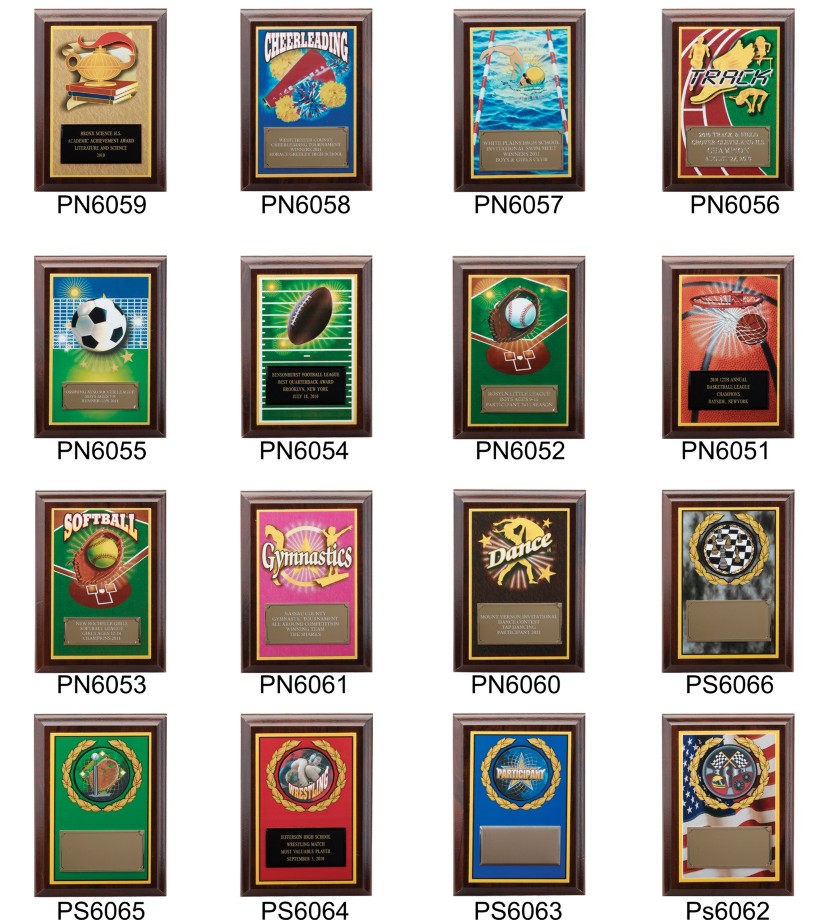 Walnut Finish Plaque with a Black Laser Engraved Plate. Choice of Sport. Size of Plaque is 5x7 Inches. (Gold Plates not available unless a minimum order of 20 identical plaques are needed). Three Lines of personalized engraving included in the price. Ships from: Mount Vernon, New York. SKU: pn605x-cm.