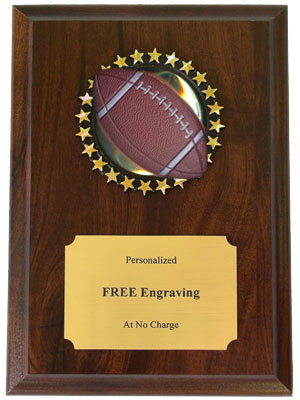 This stunning Football Plaque boasts a cherry finish and colorful 2 inch Holographic decal. Each Football plaque measures 5 x 7 inches and includes three lines of free text personalized engraving! This is a quick-ship item and typically leaves our factory in a fast 1-2 business days. This recognition item is well-priced and will make a great impression on your Football award recipient. Perfect for football season recognition and championship honors. Ships from: Marquette, Michigan. SKU: quickinplaque3dfootball-qt.
