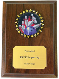 This stunning Bowling Plaque boasts a cherry finish and colorful 2 inch Holographic decal. Each Bowling plaque measures 5 x 7 inches and includes three lines of free text personalized engraving! This is a quick-ship item and typically leaves our factory in a fast 1-2 business days. This recognition item is well-priced and will make a great impression on your Bowling award recipient. Outstanding for celebrating bowling skills and dedication. Ships from: Marquette, Michigan. SKU: quickinplaquebowling-qt.