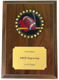This stunning Football Goal Line Plaque boasts a cherry finish and colorful 2 inch Holographic decal. Each Football plaque measures 5 x 7 inches and includes three lines of free text personalized engraving! This is a quick-ship item and typically leaves our factory in a fast 1-2 business days. Perfect for football season recognition and championship honors. Ships from: Marquette, Michigan. SKU: quickinplaquefootball-qt.