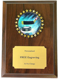 This stunning Hockey Plaque boasts a cherry finish and colorful 2 inch Holographic decal. Each Hockey plaque measures 5 x 7 inches and includes three lines of free text personalized engraving! This is a quick-ship item and typically leaves our factory in a fast 1-2 business days. This recognition item is well-priced and will make a great impression on your Hockey award recipient. Ships from: Marquette, Michigan. SKU: quickinplaquehockey-qt.