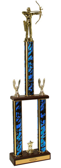 This awesome archery figure two tier championship trophy measures approximately 26-28 inches tall and is sure to be proudly displayed by your award recipient. Includes a wood base, center cup and side eagles. Includes personalization! Outstanding for recognizing archery skills and dedication. Ships from: Marquette, Michigan. SKU: qsarchttw-qtt.