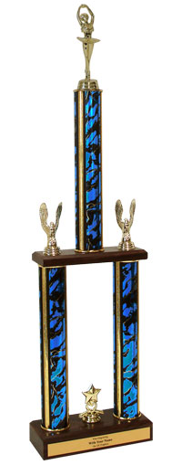 This awesome two-tier championship trophy with Ballet figure measures approximately 26-28 inches tall and is sure to be proudly displayed by your award recipient. Ballet championship trophies include a wood base, center cup and side eagles. Price includes up to 3 lines of personalized engraving! Magnificent for honoring excellence and victory. Ships from: Marquette, Michigan. SKU: qsballettw-qt.