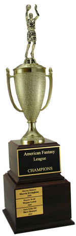 Our Perpetual Line Fantasy Basketball Trophies stand over 23 inch tall (8.75 inch cup) and feature a cherry wood base. Includes a Brass plate for the league / event name and enough room for 32 name plates. Price includes the main plate personalized engraving. Uses 1 x 3 flexi-brass plates for winners (additional small plates not included). Click to order Engraved Perpetual Trophy Flexi-Brass 1" x 3" Plates. Category: Basketball, Ideal for basketball season competitions and playoff celebrations. Ships from: Marquette, Michigan. SKU: qsbasketperp-qt.