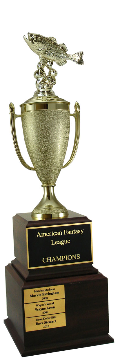 Our Perpetual Line stands over 23 inch tall (8.75 inch cup) and features a cherry wood base. Includes a Brass plate for the league / event name and enough room for 32 name plates. Price includes the main plate personalized engraving. Uses 1 x 3 flexi-brass plates for winners (additional small plates not included). Click to order Engraved Perpetual Trophy Flexi-Brass 1" x 3" Plates. Category: Fishing (Bass), Outstanding for honoring fishing skills and dedication. Ships from: Marquette, Michigan. SKU: qsbassperp-qt.