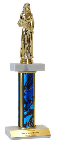 Features a gold Beauty Queen holding flowers. Two white marble bases, choice of size and free personalization! This figure is available on a wide range of matching participation and column trophies. Ships from: Marquette, Michigan. SKU: qsbeautdm-tc.