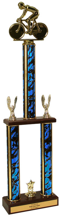 This awesome two-tier championship trophy with Bicycle figure measures approximately 26-28 inches tall and is sure to be proudly displayed by your award recipient. Bicycle championship trophies include a wood base, center cup and side eagles. Price includes up to 3 lines of personalized engraving! Distinguished piece to elegantly honor endurance, speed, and cycling excellence. Ships from: Marquette, Michigan. SKU: qsbikettw-qt.