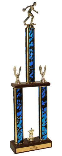 This awesome two-tier championship trophy with Bowling figure measures approximately 26-28 inches tall and is sure to be proudly displayed by your award recipient. Bowling championship trophies include a wood base, center cup and side eagles. Price includes up to 3 lines of personalized engraving! Outstanding for rewarding bowling skills and dedication. Ships from: Marquette, Michigan. SKU: qsbowlttw-qt.