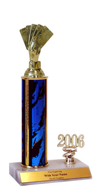 Choose from several sizes and column colors. Base: marble. Top figure: Cards Figure. Shipping: 1-2 days. Year Trim Trophy Line. Display prominently to honor winning hands and competitive play. Celebrates poker, bridge, euchre, and other competitive card games. Ships from: Marquette, Michigan. SKU: qscardsyr-qt.
