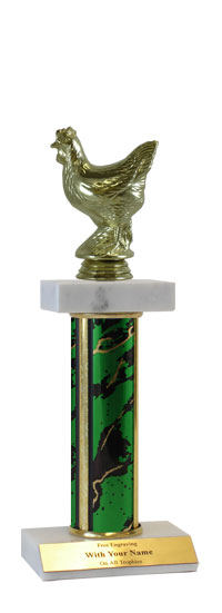 This is the ideal trophy design for 4H competitions or farm events. Customize with size, column color and up to three lines of personalization. The timeless style makes the Chicken Figure Deluxe Platform Trophy perfect for many events. Ships from: Marquette, Michigan. SKU: qschickendm-qtt.