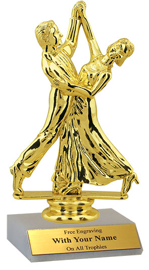 Our inexpensive, but high-quality classic participation trophy is ideal for those on a tight budget! Platform: Genuine white marble with slant front; Size: 5 1/2 - 6 inches; Personalization free!; Figurine: Dance; Keywords: Two Dancers; Tango, Slow Dance; Ships from: Marquette, Michigan. SKU: qsdancenc-qtt.
