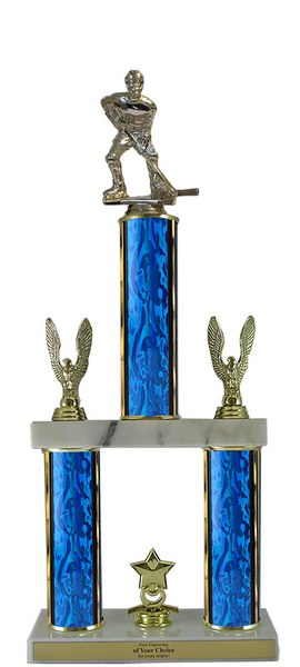 Our impressive Winners Line Award boasts two tiers, two gold eagles, a star trim, choice of column color & size, marble bases and free personalization! Perfect for special events and tournaments. Subject / Figure: Hockey. Ships from: Marquette, Michigan. SKU: qthocktt.