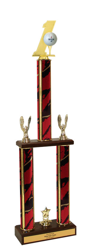 This very special championship recognition trophy with hole-in-one golf ball holder figure measures approximately 26-28 inches tall. Includes wood base, center cup and side eagles. Price includes up to 3 lines of personalization! Great for golf season events and tournament recognition. Ships from: Marquette, Michigan. SKU: qsholettw-qt.