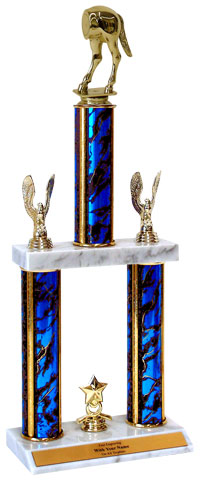 Choice of column color & size, marble bases and free personalization! A memorable award that nobody forgets winning or losing. Subject / Figure: Horses-Rear. Ships from: Marquette, Michigan. SKU: qshorsett-tc.