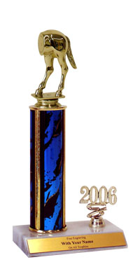 A humorous trophy that celebrates the most unforgettable finish. Choose from several sizes and column colors. Base: marble. Top figure: Horses Rear Gag. Year Trim Trophy Line. Ships from: Marquette, Michigan. SKU: qshorseyr-tc.